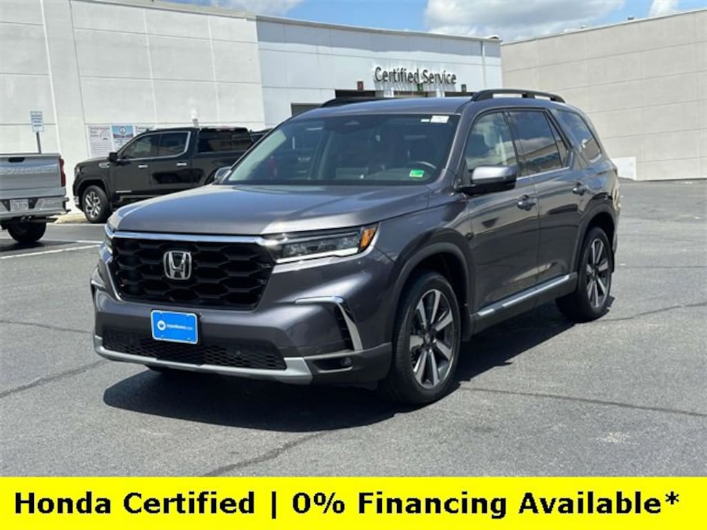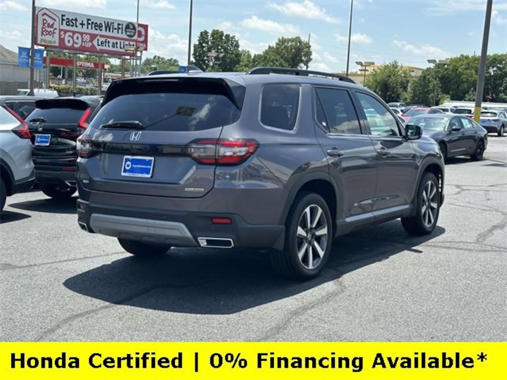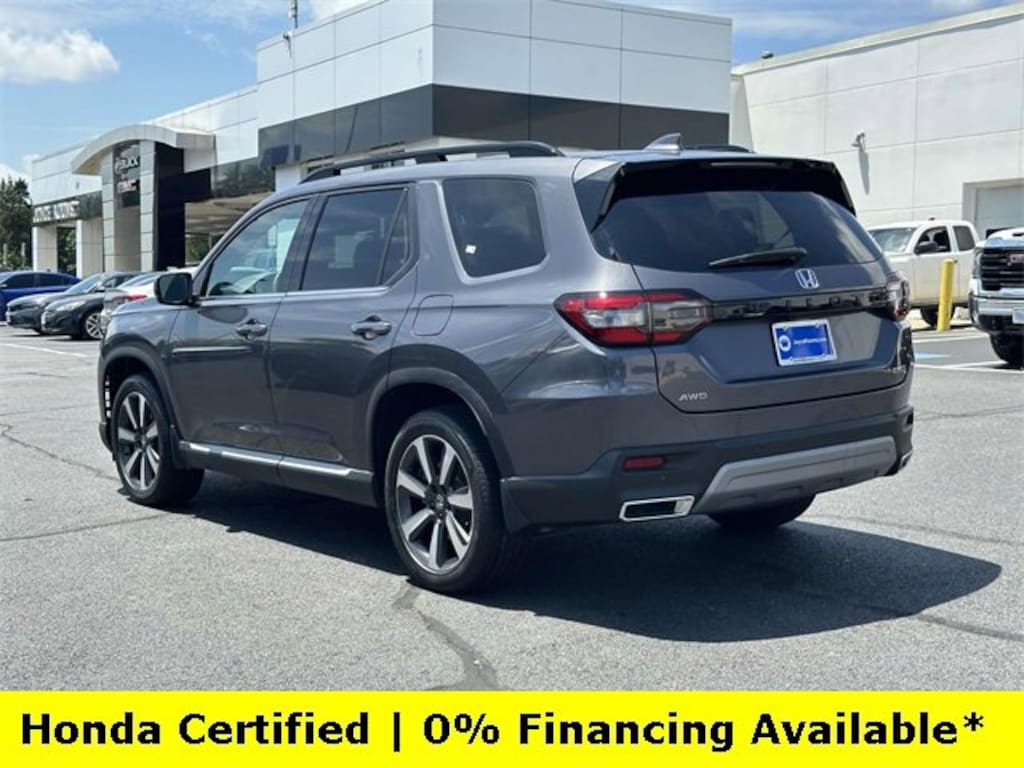 CARFAX One-Owner. Clean CARFAX. Certified. Modern Steel Metallic 2025 Honda Pilot Touring ***ONE OWNER***, ***LOW MILES***, ***DEALER MAINTAINED***, ***EXCELLENT CONDITION***, ***LOADED***, ***HONDA CERTIFIED***, ***3RD ROW SEATS***, ***ALL WHEEL DRIVE***, ***ADAPTIVE CRUISE CONTROL***, ***ALLOY WHEELS***, ***BACK UP CAMERA***, ***BLIND SIDE MONITORING***, ***FORWARD COLLISION ALERT***, ***LANE DEPARTURE WARNING***, ***HEATED SEATS***, ***LEATHER***, ***NAVIGATION***, ***POWER LIFTGATE***, ***POWER MOONROOF***, ***POWER SEATS***, ***REMOTE START***, HondaTrue Certified Certified, AWD, 12 Speakers, 3rd row seats: split-bench, 4-Wheel Disc Brakes, 4.167 Axle Ratio, ABS brakes, Adaptive Cruise Control: Adaptive Cruise Control (ACC) with Low-Speed Follow, Air Conditioning, Alloy wheels, AM/FM radio: SiriusXM, Apple CarPlay/Android Auto, Auto High-beam Headlights, Auto-dimming Rear-View mirror, Automatic temperature control, Blind Spot Information (BSI) System warning, Bose Premium Sound System, Brake assist, Bumpers: body-color, Compass, Delay-off headlights, Driver door bin, Driver vanity mirror, Dual front impact airbags, Dual front side impact airbags, Electronic Stability Control, Emergency communication system: HondaLink, Exterior Parking Camera Rear, Four wheel independent suspension, Front anti-roll bar, Front Bucket Seats, Front Center Armrest, Front dual zone A/C, Front fog lights, Front reading lights, Fully automatic headlights, Garage door transmitter: HomeLink, Heated door mirrors, Heated Front Bucket Seats, Heated front seats, Honda Satellite-Linked Navigation System, HondaLink Subscription Services, Illuminated entry, Knee airbag, Lane departure: Lane Keeping Assist System (LKAS) active, Leather Seat Trim, Low tire pressure warning, Memory seat, Navigation system: Honda Satellite-Linked Navigation System, Occupant sensing airbag, Outside temperature display, Overhead airbag, Overhead console, Panic alarm, Passenger door bin, Passenger vanity mirror, Power door mirrors, Power driver seat, Power Liftgate, Power moonroof, Power passenger seat, Power steering, Power windows, Radio data system, Rear air conditioning, Rear anti-roll bar, Rear reading lights, Rear seat center armrest, Rear window defroster, Rear window wiper, Reclining 3rd row seat, Remote keyless entry, Security system, SiriusXM, Speed control, Speed-sensing steering, Speed-Sensitive Wipers, Split folding rear seat, Spoiler, Steering wheel mounted audio controls, Tachometer, Telescoping steering wheel, Tilt steering wheel, Traction control, Trip computer, Turn signal indicator mirrors, Variably intermittent wipers, Wheels: 20 Shark Gray Machine Face w/Blk Lug Nuts, AWD.