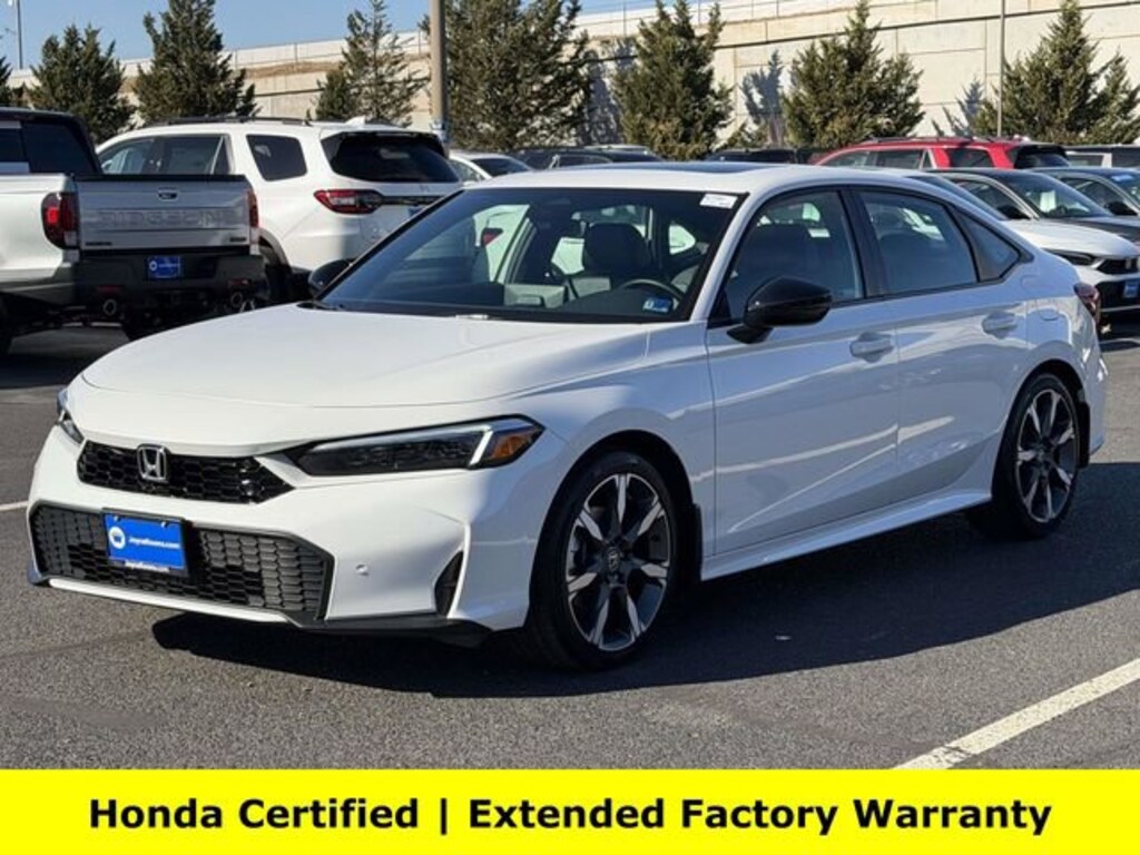 Clean CARFAX. Certified. Platinum White Pearl 2026 Honda Civic Hybrid Sport Touring ***ONE OWNER***, ***LOW MILES***, ***DEALER MAINTAINED***, ***EXCELLENT CONDITION***, ***LOADED***, ***HONDA CERTIFIED***, ***ADAPTIVE CRUISE CONTROL***, ***ALLOY WHEELS***, ***BACK UP CAMERA***, ***BLIND SIDE MONITORING***, ***FORWARD COLLISION ALERT***, ***LANE DEPARTURE WARNING***, ***HEATED SEATS***, ***LEATHER***, ***BOSE SOUND***, ***NAVIGATION***, ***POWER MOONROOF***, ***POWER SEATS***, ***REMOTE START***, HondaTrue Certified Certified, 2.0L 16V DOHC, 12 Speakers, 4-Wheel Disc Brakes, ABS brakes, Adaptive Cruise Control: Adaptive Cruise Control (ACC) with Low-Speed Follow, Air Conditioning, Alloy wheels, AM/FM radio, Apple CarPlay/Android Auto, Auto High-beam Headlights, Auto-dimming Rear-View mirror, Automatic temperature control, Blind Spot Information (BSI) System warning, Bose Premium Sound System, Brake assist, Bumpers: body-color, Compass, Delay-off headlights, Driver door bin, Driver vanity mirror, Dual front impact airbags, Dual front side impact airbags, Electronic Stability Control, Emergency communication system: HondaLink, Exterior Parking Camera Rear, Four wheel independent suspension, Front anti-roll bar, Front Bucket Seats, Front Center Armrest, Front dual zone A/C, Front reading lights, Fully automatic headlights, Heated door mirrors, Heated Front Bucket Seats, Heated front seats, Illuminated entry, Knee airbag, Leather Shift Knob, Leather steering wheel, Leather-Trimmed Seat Trim, Low tire pressure warning, Navigation system: Google Maps, Occupant sensing airbag, Outside temperature display, Overhead airbag, Overhead console, Panic alarm, Passenger door bin, Passenger vanity mirror, Power door mirrors, Power driver seat, Power moonroof, Power passenger seat, Power steering, Power windows, Radio data system, Rain sensing wipers, Rear anti-roll bar, Rear seat center armrest, Rear side impact airbag, Rear window defroster, Remote keyless entry, Security system, Speed control, Speed-sensing steering, Split folding rear seat, Steering wheel mounted audio controls, Tachometer, Telescoping steering wheel, Tilt steering wheel, Traction control, Trip computer, Turn signal indicator mirrors, Variably intermittent wipers, Wheels: 18 Alloy with Matte Shark Gray Inserts, 2.0L 16V DOHC.